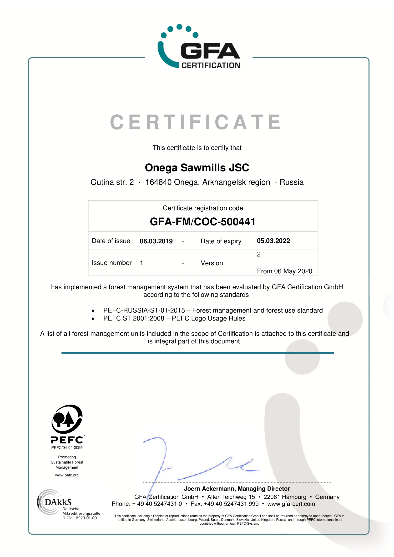 С 2018 г. Организация вовлечена в процесс добровольной лесной сертификации по системе PEFC (Programme for the Endorsement of Forest Certification Schemes). Программа по объединению схем лесной сертификации, в недавнем прошлом - Паневропейская система сертификации.